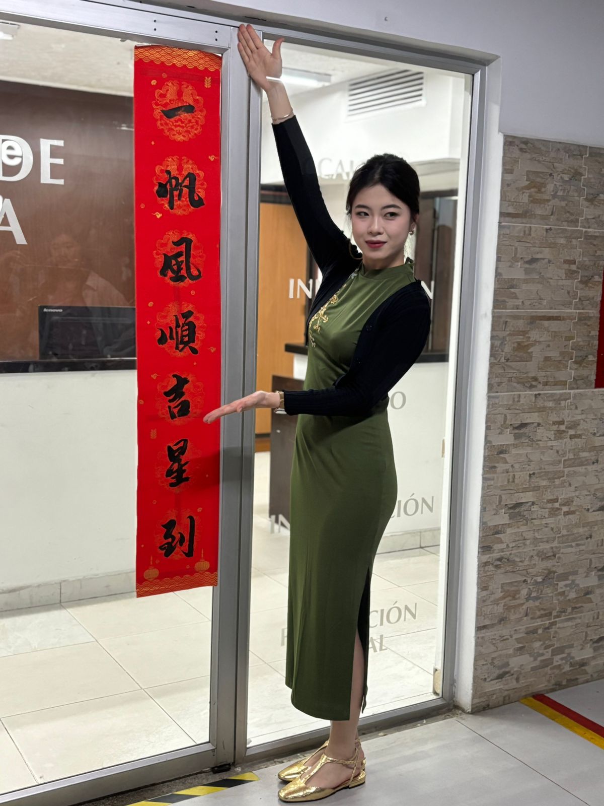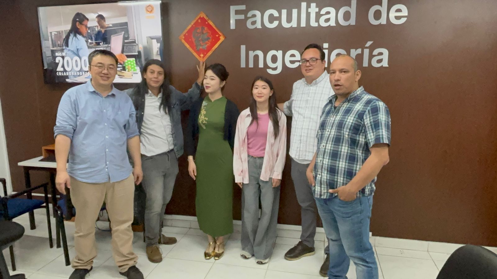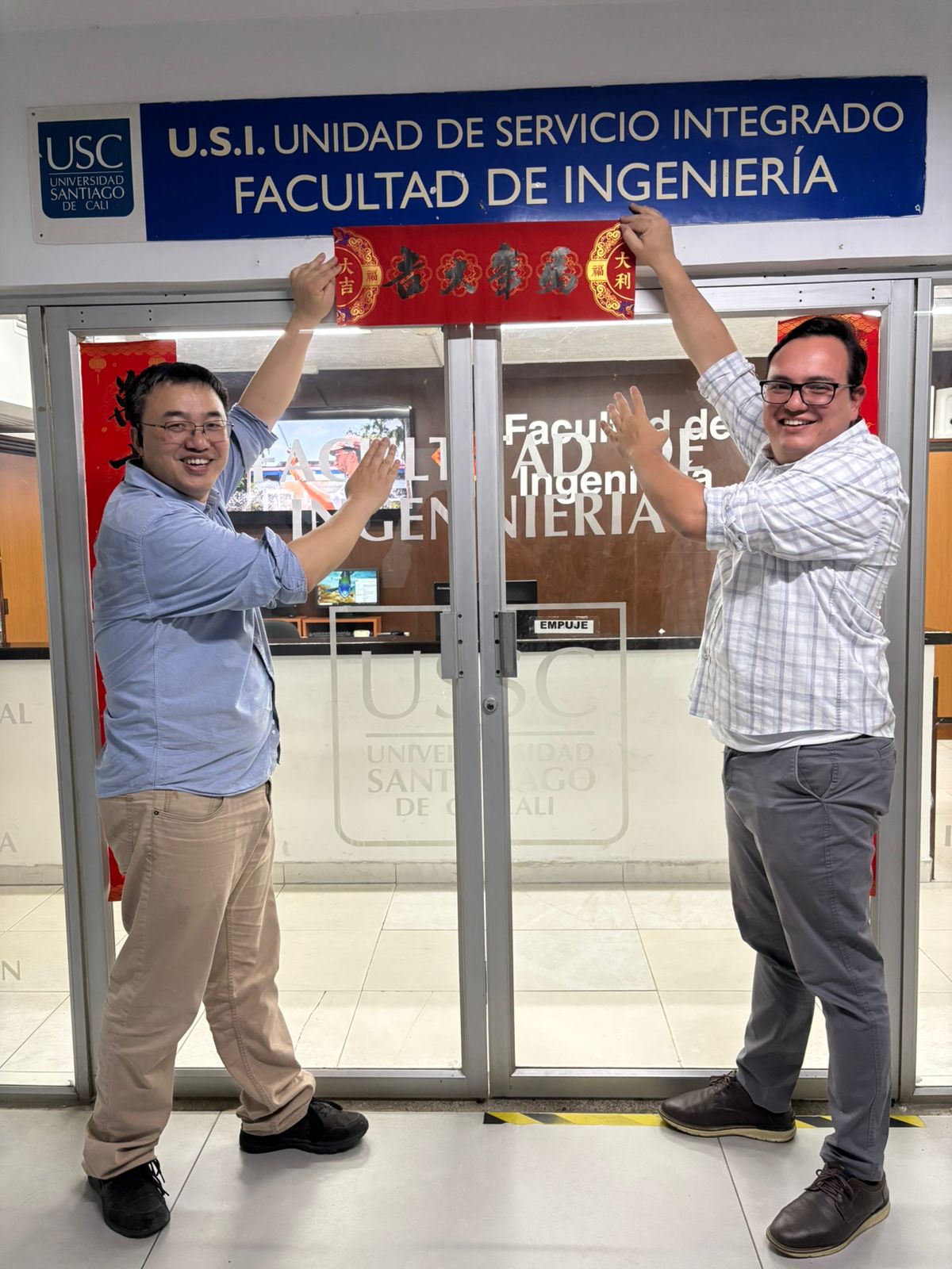 春节是中华民族每年最隆重的节日,贴春联活动必不可缺。2月16日下午,学测中心团队来到卡利大学工学院,与院长Jhon Vargas(约翰·巴尔加斯)及工学院教师一起张贴对联共迎新春。活动现场,大家齐心协作,中文老师们细致向哥伦比亚朋友讲解春联的文化寓意,耐心示范张贴技巧。工学院的老师们积极配合,递胶带、扶春联、调间距,每一个动作都饱含默契。
